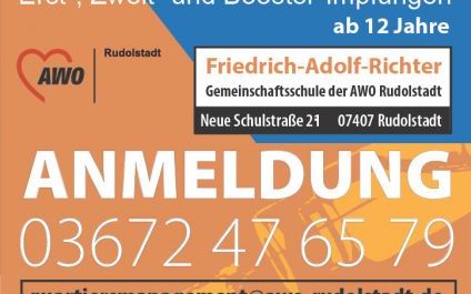 Am Donnerstag, 21. April 2022, heißt es ab 12:30 Uhr an unserer Friedrich-Adolf-Richter-Schule wieder "Ärmel hoch!". Es ist bereits die fünfte Impfaktion - organisiert vom Förderverein der Gemeinschaftsschule gemeinsam mit dem AWO-Quartiersmanagement. Das Angebot gilt für Erst-, Zweit- und Booster-Impfungen und richtet sich an alle Personen ab 12 Jahren.