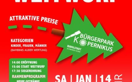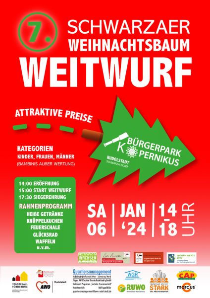 Der Schwarzaer Weihnachtsbaumweitwurf ist zurück! Am Samstag, dem 06. Januar 2024, ab 14:00 Uhr im Bürgerpark Kopernikus Schwarza Nord erwartet euch ein winterliches Spektakel für die ganze Familie! Freut euch auf spannende Wettbewerbe in verschiedenen Kategorien für Kinder, Frauen und Männer.