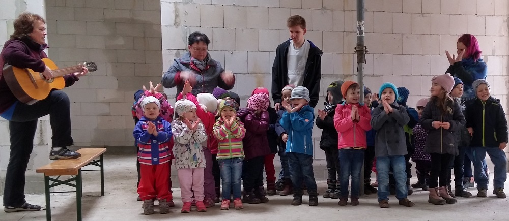 Nach einer kurzen Vorstellung durch die Einrichtungsleiterin Frau Julia Harnge gaben die kleinen Burgbewohner der Gruppen „Enten“ und „Grüne Geister“ einen musikalischen Einstand. Als Dankeschön hierfür überreichte anschließend der Geschäftsführer der AWO, Herr Tschoepke einen Präsentkorb mit Süßigkeiten, über welchen natürlich umgehend hergefallen wurde.