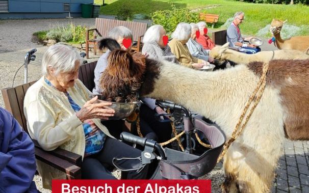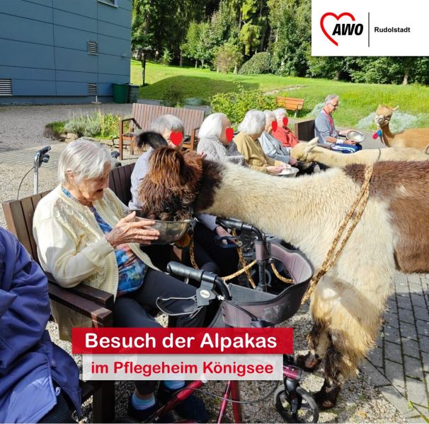 In der vergangenen Woche erhielt das AWO Pflegeheim in Königsee flauschigen Besuch von den Alpakas vom Roten Berg. Bewohnerinnen und Bewohner ließen sich von den herrlichen Tieren verzaubern. Auch unsere Mitarbeiterinnen und Mitarbeiter kamen in den Genuss, die Alpakas zu streicheln, füttern und zu bestaunen.