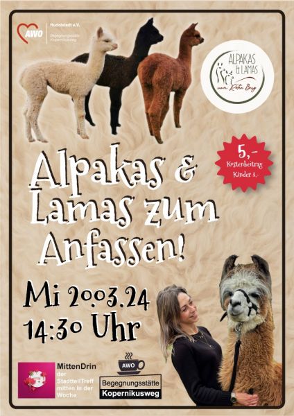Es ist wieder soweit! Die charmanten und gutmütigen Alpakas und Lamas vom Roten Berg sind zurück, um uns mit ihrer Anwesenheit zu erfreuen. Am Mittwoch, den 20. März, laden wir herzlich ein, diese besonderen Momenten mit uns in der AWO-Begegnungsstätte Kopernikusweg zu verbringen und die faszinierenden Tiere hautnah zu erleben.
