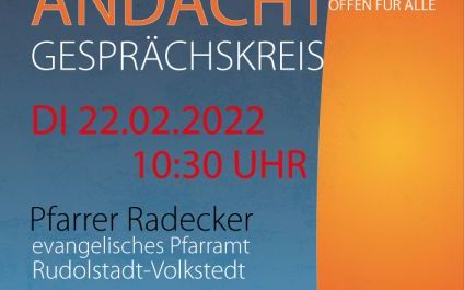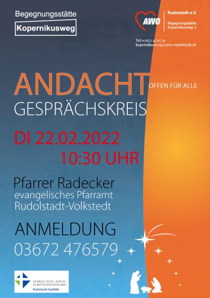 Auf mehrfache Anfrage von Bewohner/innen ist es der AWO Begegnungsstätte Kopernikusweg in Kooperation mit der evangelischen Kirche Rudolstadt gelungen, ein neues Veranstaltungsformat anzubieten. Unter der Überschrift „Andacht“ wird am Dienstag, den 22.02.22, ab 10:30 Uhr, in der AWO Begegnungsstätte Kopernikusweg Pfarrer Radecker des evangelischen Pfarramts Rudolstadt Volkstedt mit den Gästen ins Gespräch kommen sowie mit einer musikalischen Umrahmung innehalten. Das Angebot steht allen Interessierten offen und soll in regelmäßigen Abständen wiederholt werden.