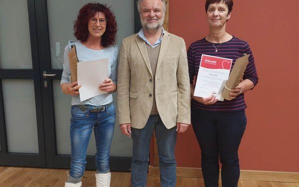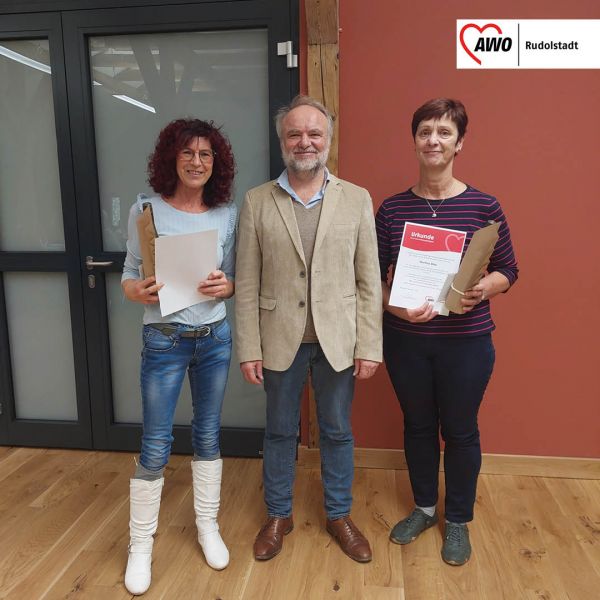 Auf dem Bild zu sehen ist die Ehrung von Marion Gieseler und Martina Böse, die jeweils beeindruckende 45 Jahre bei der AWO Rudolstadt tätig sind.