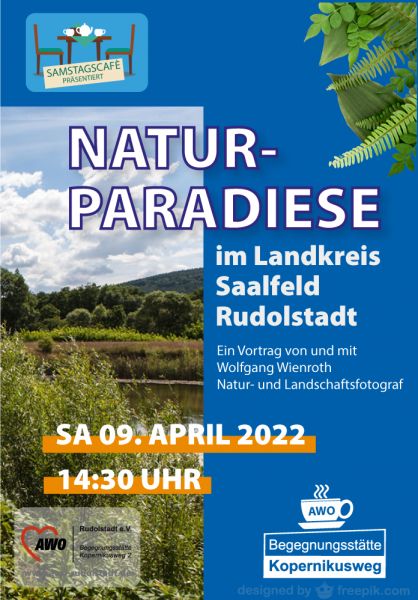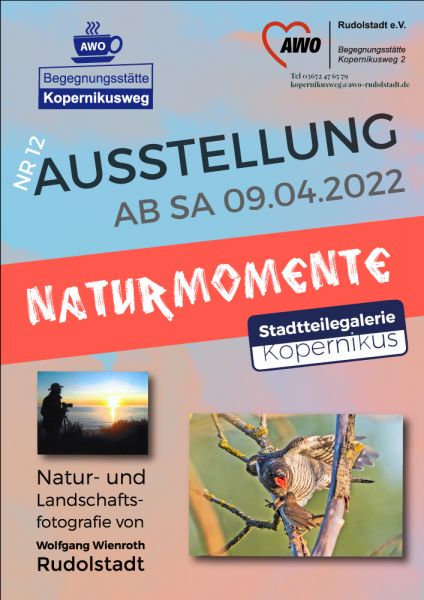 Am Samstag, den 09.04.2022, ab 14:30 Uhr, wird Wolfgang Wienroth aus Rudolstadt in der AWO Begegnungsstätte Kopernikusweg mit einem Fotovortrag über Naturparadiese in unserer unmittelbaren Umgebung, sein Publikum begeistern. Damit endet, nach dem über zwei jährigen coronabedingten Einschränkungen, die lang ersehnte Veranstaltungspause, innerhalb des beliebten SamstagsCafè. In seinem Vortrag berichtet der pensionierte Umweltschutzbeauftragte über seine leidenschaftlichen und detailreichen Naturbeobachtungen, in unserer unmittelbaren Umgebung. Seit 2010 hält er seine Beobachtungen auch fotografisch fest und beeindruckt durch seine durchinszenierten Tier- und Landschaftsfotografien. Zeitgleich sind auch eine Auswahl einiger Fotos in der mittlerweile 12. Ausstellung der Stadtteilegalerie Kopernikus unter dem Titel „NATURMOMENTE“, während der regulären Öffnungszeiten, noch bis zum 20.05., zu bestaunen.