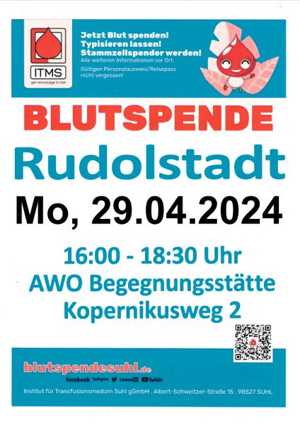 Machen Sie einen Unterschied! Die AWO-Begegnungsstätte Kopernikusweg lädt herzlich zur Blut- und Plasmaspende ein. Am Montag, den 29. April, um 16:00 Uhr haben Sie die Chance, Leben zu retten und gleichzeitig die angenehme Atmosphäre unserer Begegnungsstätte zu erleben. In Zusammenarbeit mit dem ITM Suhl werden erfahrene Fachleute bereitstehen, um die Spenden professionell durchzuführen. Nach der Spende erwartet Sie außerdem ein reichhaltiges Büfett in gemütlicher Atmosphäre. Wir freuen uns auf Ihre Teilnahme und bedanken uns im Voraus für Ihre Unterstützung!