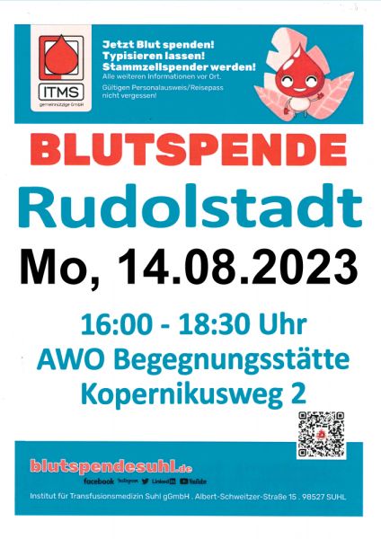 Heute findet wieder von 16:00 bis 18:00 Uhr die Blutspende des ITM Suhl in der AWO Begegnungsstätte Kopernikusweg statt.