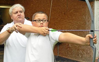 Trainerin Bärbel Sättler gibt Lucas Max Ulitzsch Tipps. Der 10-Jährige trainiert seit drei Jahren regelmäßig Bogenschießen beim PSSV Rudolstadt. Foto: Heike Enzian