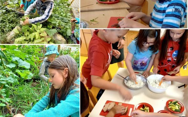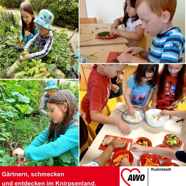 Im Bild zu sehen, sind Delfinen-Knirpse bei der Ernte von Kräutern und deren Verarbeitung zu einem gesunden Essen. Die Gruppe beteiligt sich seit Juni an der Mitmachaktion der AOK Plus "Bunte Vielfalt für gesunde Kinder". Ihre Projektaufgabe lautet: Lecker schmecken und entdecken - Wir zaubern mit Phantasie, Kreativität und Wissbegierde wieder mehr gesundes Essen auf den Tisch und essen bunt in allen Farben des Regebogens!