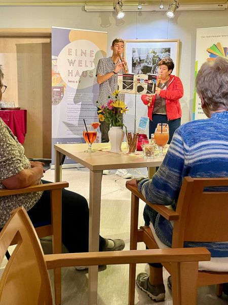 Die Vernissage wurde von der Flötengruppe der Rudolstädter Musikschule musikalisch umrahmt, und wir bedanken uns herzlich bei Herrn Ulrich Hoffmann vom Eine Welt Haus e.V. in Jena für die Organisation und seine wertvollen Beiträge zur Eröffnung.