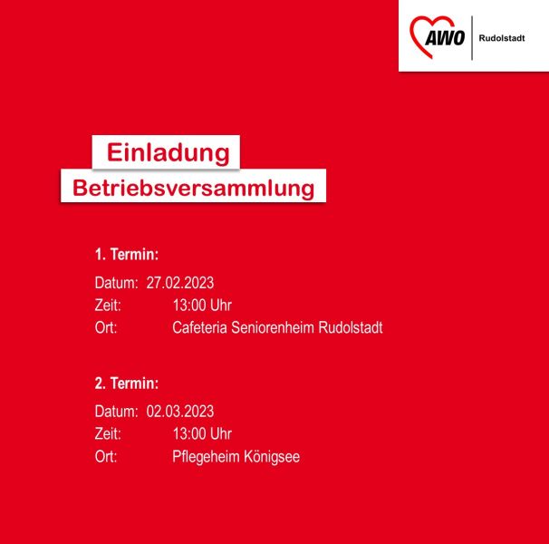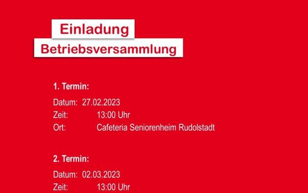 hiermit laden wir euch zu unserer Betriebsversammlung ein. Diese findet am Montag, den 27.02.2023 um 13:00 Uhr in der Cafeteria des Seniorenheims Rudolstadt statt, sowie am 02.03.2023 um 13:00 Uhr im Pflegeheim Königsee.