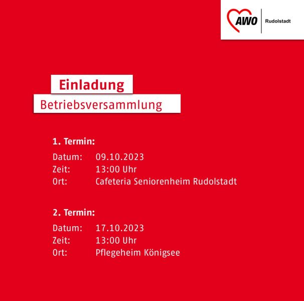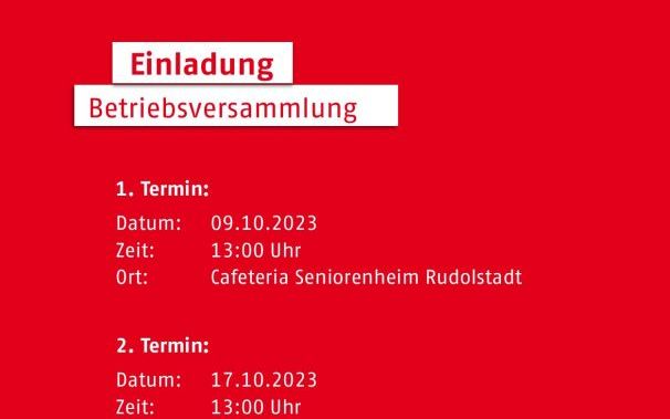 hiermit laden wir euch zu unserer Betriebsversammlung ein. Diese findet am Montag, den 09.10.2023 um 13:00 Uhr in der Cafeteria des Seniorenheims Rudolstadt statt, sowie am 17.10.2023 um 13:00 Uhr im Pflegeheim Königsee.