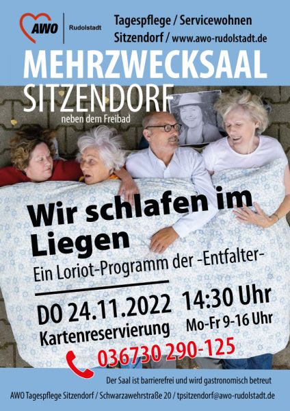 Mit ihrem neusten Programm „Wir schlafen im Liegen“ begibt sich die Seniorentheatergruppe der AWO Rudolstadt die „Entfalter“ auf die Spuren eines der beliebtesten und vielseitigsten deutschen Unterhaltungskünstler der letzten Jahrzehnte. Die „Entfalter“ bieten einen ganz besonderen Blick auf die kleinen und großen menschlichen Schwächen mit ungebändigter Spielfreude.