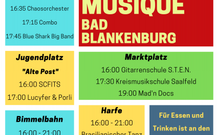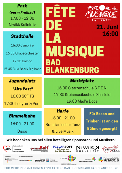 Am Mittwoch, dem 21. Juni 2023, ist es endlich soweit - das AWO Jugendhaus Bad Blankenburg lädt zur Fête de la Musique Bad Blankenburg von 16 bis 22 Uhr ein. An sechs verschiedenen Veranstaltungsorten in der Stadt Bad Blankenburg zeigen verschiedenste Künstler sowie Gruppen ihr Können.