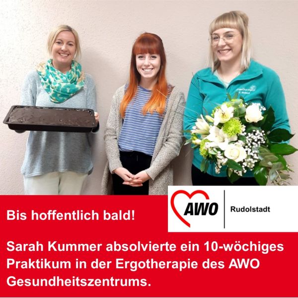 Schweren Herzens hat sich das Team des Gesundheitszentrums der AWO Rudolstadt von Praktikantin Sarah Kummer (Bildmitte) verabschiedet. Zehn Wochen hat die angehende Ergotherapeutin sowohl gelernt als auch schon richtig gut unterstützt. Melanie Adam und Carolin Stubert (v.l.n.r.) haben Sarah durch ihr Praktikum begleitet und sind sich einig: "Wir freuen uns, dass es so tolle Nachwuchskräfte gibt. Am liebsten würden wir Sarah gleich in unser Team aufnehmen." Aber das muss noch ein bisschen warten. Sarah ist im dritten Lehrjahr an der Euro-Schule in Pößneck und macht dort bald ihren Abschluss. Liebe Sarah, danke, dass Du bei uns warst! Du bist jederzeit willkommen, uns und vor allen Dingen unsere Klienten zu bereichern.