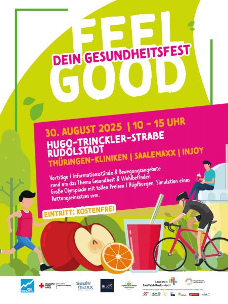 Am Samstag, den 30. August 2025 von 10:00 bis 15:00 Uhr findet das Feel Good Gesundheitsfest des Landkreises Saalfeld‑Rudolstadt statt – und die AWO Rudolstadt ist mit einem bunten Mitmach‑Angebot dabei – direkt vor dem Saalemaxx!