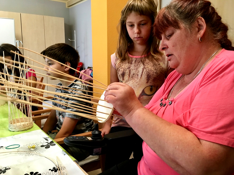 Unterstützung bekamen die Kinder auch von der über 80-jährigen Rosemarie Renner und Birgit Bär, die beide schon lange ihre Leidenschaft zum Flechten entdeckt haben. Die Erzieherin Frau Horn nutzte die Zeit um sich im Flechten mit kleinen Rollen aus Zeitungspapier zu üben. Diese Technik möchte Frau Horn in Zukunft in ihrer eigenen Einrichtung mit den Kindern weiter verfeinern. Nach über zwei Stunden konzentrierter Arbeit schöpften sich alle auf der wunderschönen neu eingerichteten Terrasse bei Limo, Melone und selbstgebackenen Kuchen. Trotz Altersunterschied kamen spannende Gespräche zu Stande, bevor wieder weitergearbeitet wurde.