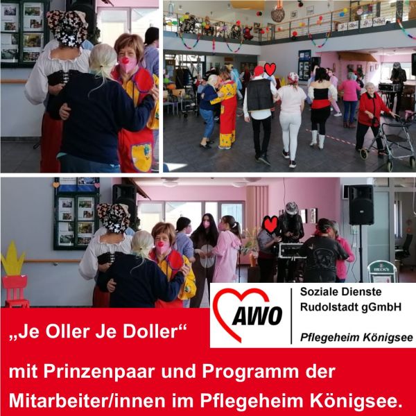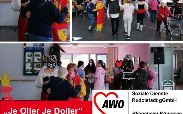 Bereits in der vergangenen Woche wurde das Pflegeheim Königsee festlich mit selbstgebastelter Faschings-Deko geschmückt. Am Rosenmontag wurde die 5.Jahreszeit dann gefeiert. Das Prinzenpaar mit Sybille die Erste, eine Bewohnerin des Heimes als Prinzessin und Georg der Erste, eine Pflegefachkraft als Prinz, wurde die Sause eröffnet. Getreu des Mottos des Heimes: „Je Oller Je Doller“ AWO Königsee Allleee! gab es ausgelassene Tanzrunden der Bewohner/innen und ein Programm der Mitarbeiter/innen, welche sich so richtig ins Zeug legten und Piratentänze selbst choreographierten.