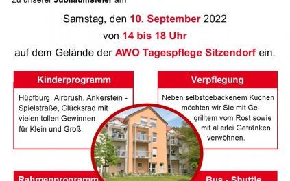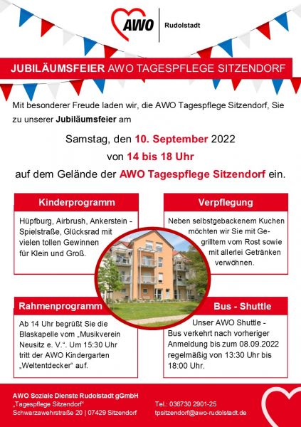 Deshalb lädt die Tagespflege Sitzendorf Euch mit besonderer Freude zu ihrer Jubiläumsfeier am Samstag, den 10. September 2022, von 14 bis 18 Uhr ein. Die Veranstaltung wird auf dem Gelände der Tagespflege Sitzendorf, in der Schwarzawehrstraße 20 in 07429 Sitzendorf stattfinden. Mit Live-Musik, einer Hüpfburg, der Ankerstein-Spielstraße und vielen weiteren Mitmach-Aktionen ist für Spaß und Unterhaltung bei kleinen und großen Gästen bestens gesorgt. Natürlich ist auch die Tagespflege für Besichtigungen geöffnet. Nach vorheriger Anmeldung bis zum 08.09.2022 wird es zudem einen Bus-Shuttle geben, der im Zeitraum von 13:30 Uhr bis 18:00 Uhr verkehren wird.