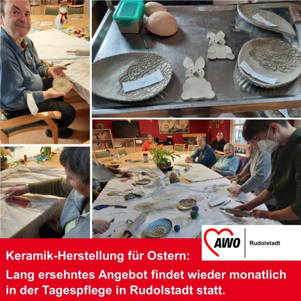 Während die Temperaturen bereits leicht nach oben klettern und die Sonne erste Frühlingsstrahlen sendet, werden in unserer Tagespflege in Rudolstadt schon die Osterbasteleien eingeläutet. Nach längerer Pause startet wieder das Töpfer-Angebot, sehr zur Freude unserer Gäste. Im monatlichen Rhythmus werden mit Unterstützung der Betreuung des Seniorenheims kreative Werke geformt und anschließend bemalt. Passend zur Jahreszeit entstanden in dieser Woche Hasen und Schalen für Ostereier und co., kommenden Monat werden diese dann bemalt.