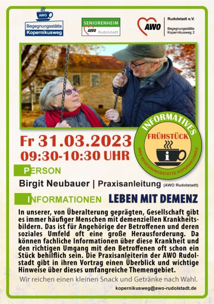 In unserer überalterten Gesellschaft beobachten wir einen Anstieg an Betroffene mit demenziellen Krankheitsbildern. Die Praxisanleiterin der AWO Rudolstadt gibt in ihren Vortrag wichtige Informationen zum Krankheitsbild, sowie mögliche unterstützende Umgangsstrategien. Dies soll der Auftakt für eine regelmäßige, monatliche Informations- und Austauschrunde zu diesem Thema in der Begegnungsstätte werden. Anmeldung ist nicht erforderlich.