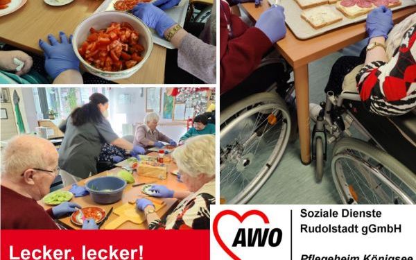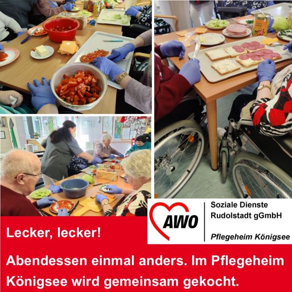 Im Pflegeheim Königsee wird gemeinsam gekocht. Einen frischen Salat und überbackenes Toast bereiteten sich die Bewohner/innen des Heimes mit Unterstützung der Mitarbeiter/innen der Betreuung selbst zu. Das Essen im Anschluss an die gemeinsame Vorbereitung in geselliger Runde schmeckte daher umso besser.
