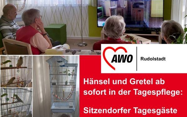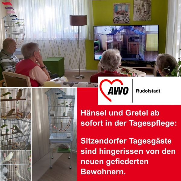 Vor ein paar Wochen hatte unsere Tagespflege Sitzendorf Besuch von Lamas und Alpakas - ein Erlebnis, über das immer noch gesprochen wird. Der tierische Besuch löste bei den Tagesgästen so viel Freude aus, dass die Mitarbeiter/innen nun beschlossen haben, diese Freude zum Dauerzustand zu machen. Nun bietet die Sitzendorfer Tagespflege nicht unbedingt Platz für kleine Kamele. Aber für kleines Federvieh schon! Und so ist letzte Woche mit Hänsel und Gretel ein zauberhaftes Wellensittich-Pärchen eingezogen.