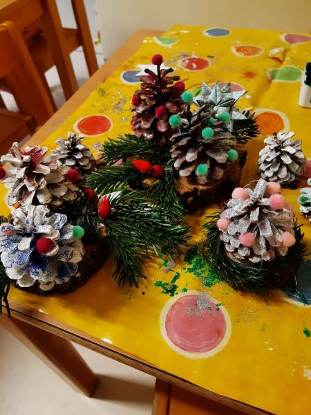 Im Kindergarten Feste Burg wurden fleißig kleine Tannenbäume aus Zapfen gebastelt. Die bunten Kunstwerke sind echte Hingucker.