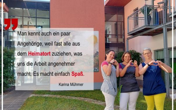 Auch Karina Mühmer ist seit nunmehr 19 Jahren ein fester Bestandteil der AWO Familie. „Die Einrichtung hat mir seit 2003 sehr gut gefallen, da es in der ländlichen Gegend ist und ich es nicht weit auf Arbeit habe – klein, mit 60 Bewohnern schön überschaubar. Man kennt auch ein paar Angehörige, weil fast alle aus dem Heimatort zuziehen, was uns die Arbeit angenehmer macht. Es macht einfach Spaß.“