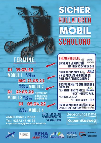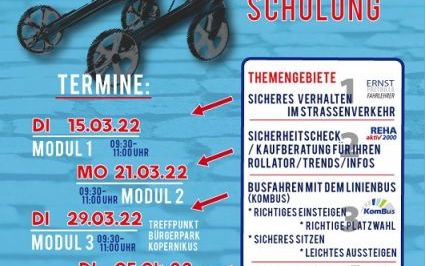Die Mobilität in allen Lebenslagen und Lebensaltern zu erhalten, ist ein wesentlicher Teil eines erfüllten Lebens. Beweglichkeit bedeutet Teilhabe - Teilhabe am sozialen, wie am kulturellen Leben und ist somit nicht zu unterschätzen. Mit einem erprobten vierteiligen Kursangebot wollen die Initiatoren Menschen bei der Erhaltung ihrer Mobilität behilflich sein. In der vierteiligen Schulungsserie zum Thema Mobilität sollen hierbei Mobilitätshilfen wie zum Beispiel der Rollator in den Focus rücken. Expert/innen aus den unterschiedlichsten Fachgebieten werden ihr theoretisches und praktisches Wissen an Interessierte weitergeben. Auch ist es möglich nur einzelne Module auszuwählen. Ein mitgebrachter Rollator ist hilfreich aber nicht zwingend. Die Teilnahme ist kostenfrei und bestimmt auch für pflegende und betreuende Angehörige oder auch als Allgemeinwissen interessant.