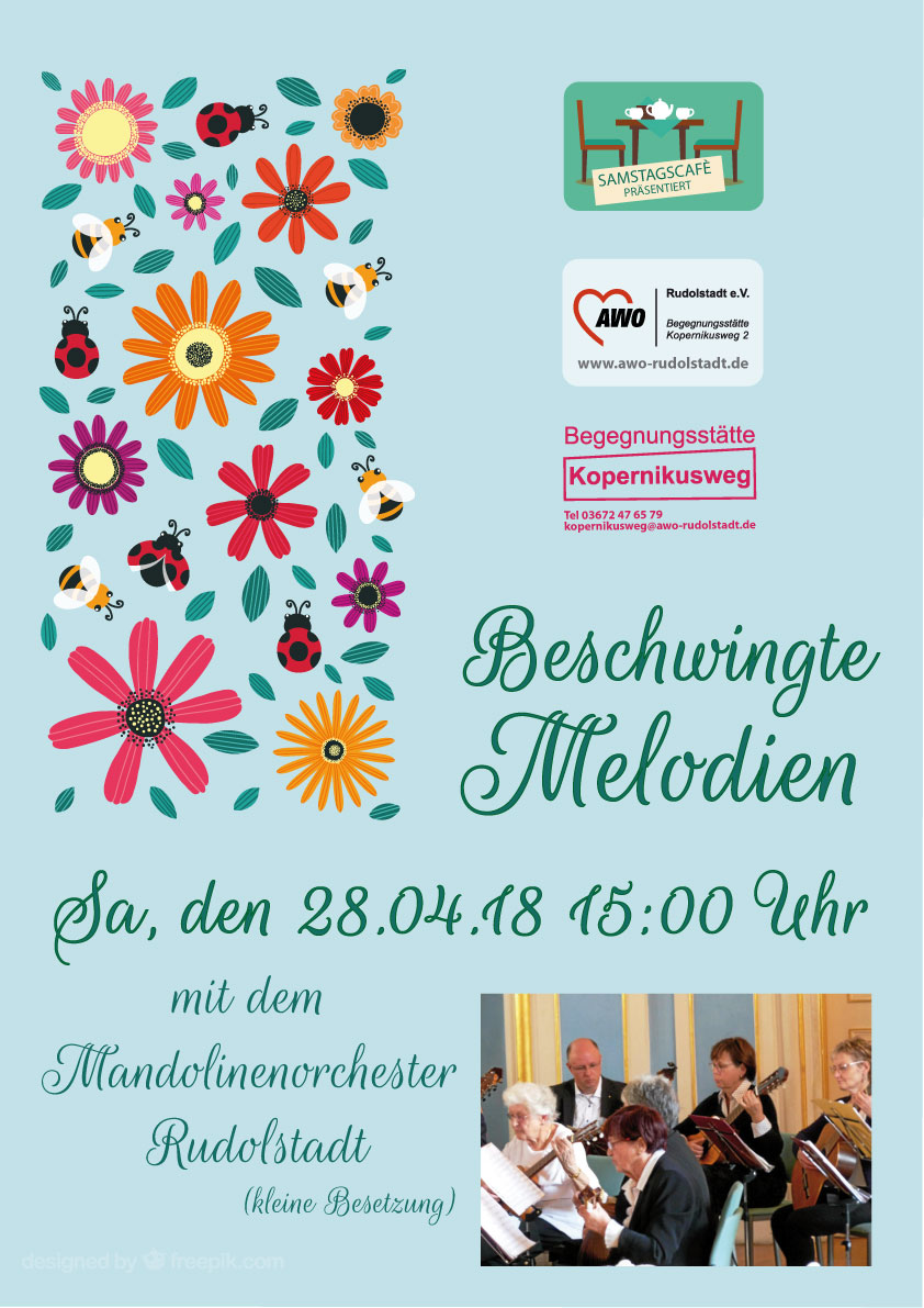Die Freunde der Mandolinenmusik können sich am darauffolgenden Samstag, 28. April, beim Konzert des Mandolinenorchesters Rudolstadt im Rahmen des Samstagscafés in der Cafeteria der Begegnungsstätte auf viele musikalische Leckerbissen freuen. Los geht es hier um 15 Uhr.
