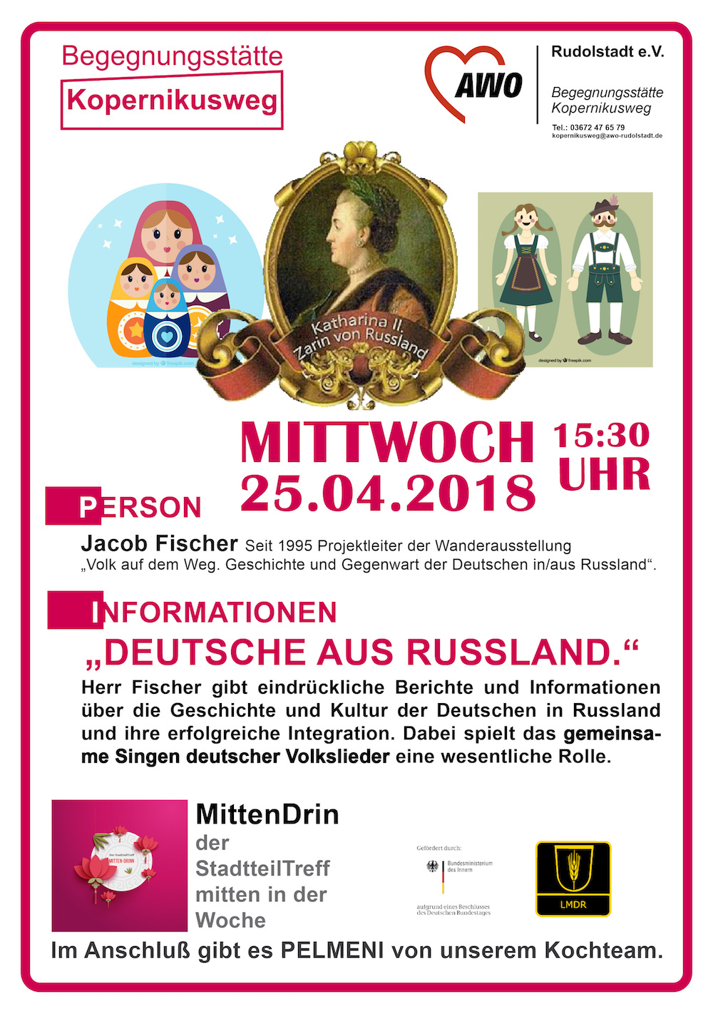 Das gemeinsame Singen deutscher Volkslieder dient Jacob Fischer als verbindendes und sinnliches Element, um den Besuchern am Mittwoch, 25.April, ab 15.30 Uhr die mehr als 200-jährige und sehr bewegende Geschichte der Deutschen russischer Herkunft näher zu bringen. Die Veranstaltung läuft im Rahmen der gleichnamigen Ausstellung im alten Rathaus von Rudolstadt. Im Anschluss wartet auf alle eine selbst zubereitete russische Spezialität.