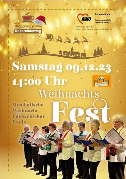 Feiern Sie mit uns das musikalische Weihnachtsfest in der AWO Begegnungsstätte Kopernikusweg! Am Samstag, den 9. Dezember 2023, ab 14:00 Uhr, lädt unsere Begegnungsstätte herzlich ein, ein zauberhaftes „Musikalisches Weihnachtsfest“ zu erleben. Der Edelweißchor aus Ranis unter der Leitung von Klaus Hollmann wird für ein mitreißendes musikalisches Programm sorgen. Tauchen Sie ein in die festliche Atmosphäre unserer geschmückten Räumlichkeiten und genießen Sie die erstklassige Versorgung durch unser bewährtes Team. Freuen Sie sich auf ein unvergessliches Fest voller Musik und besinnlicher Momente!