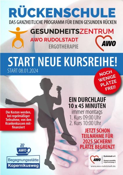 Starten Sie das neue Jahr mit einem gesunden Rücken! Ab kommenden Montag, dem 08.01.2024, startet in unserer Begegnungsstätte Kopernikusweg ein neuer Rückenschulkurs, durchgeführt vom AWO Gesundheitszentrum. Sichern Sie sich noch heute Ihren Platz! Anmeldungen sind beim AWO Gesundheitszentrum unter der Telefonnummer (03672) 82 98 816 möglich.