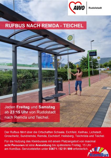 Nicht vergessen – jeden Freitag und Samstag verkehrt ab 23:15 Uhr ein Rufbus von Rudolstadt nach Remda und Teichel. Die Anmeldung muss bis spätestens Freitag, 15 Uhr unter dem KomBus-Servicetelefon 03671 / 52 51 999 angemeldet werden. Der Kleinbus mit einem Platzangebot von maximal acht Personen fährt über die Ortschaften Schaala, Eichfeld, Keilhau, Lichstedt, Groschwitz, Sundremda, Remda, Eschdorf, Heilsberg, Teichröda und Teichel.
