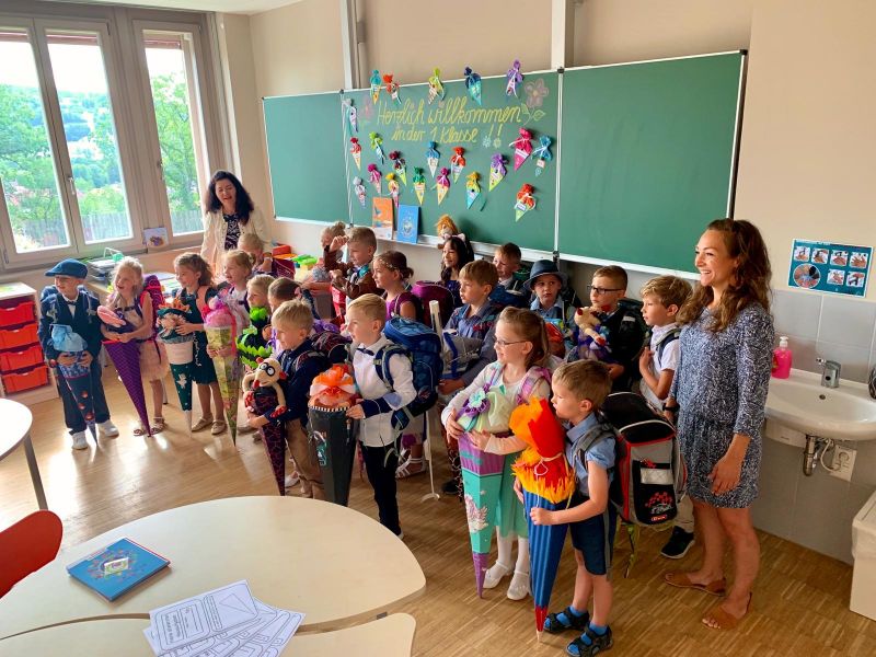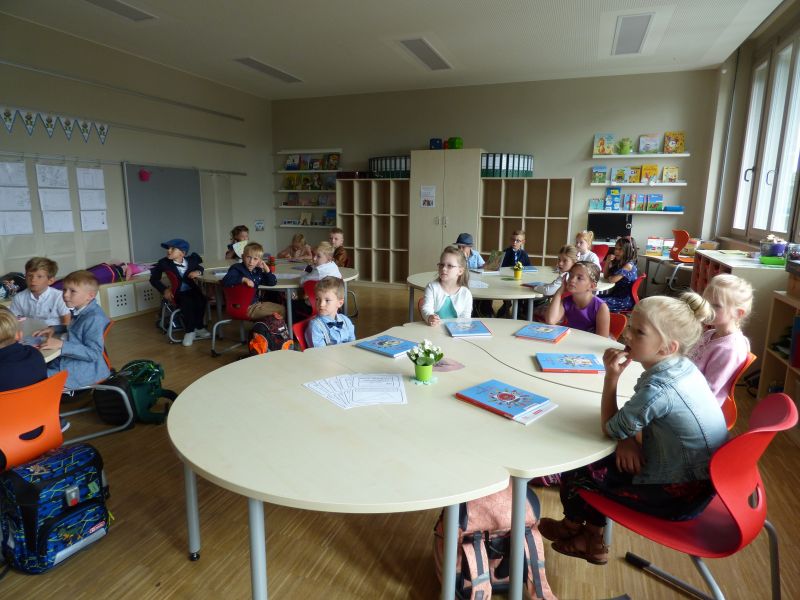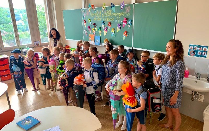 In der Aula unserer Schule fand am Samstag Vormittag die gelungene Schuleinführung der Klasse 1 statt. Musikalisch wurde die Stunde umrahmt durch Herrn Beier am Klavier und Frau Engelhardt auf der Trompete. In einem Bilderbuchkino präsentierte Thea Kneisel, die Schulleiterin, den Kindern die Geschichte vom Löwen, der nicht schreiben konnte. Kurz darauf überreichte Frau Stockmann, die Klassenlehrerin, den Kindern ihren Schulranzen. Frau Reichling, die Erzieherin der Kinder, übergab die individuell und phantasievoll gestalteten Zuckertüten. Gemeinsam ging es dann zum ersten Mal in den Klassenraum und dort lag schon die Fibel und das Mathebuch für jedes Kind bereit.