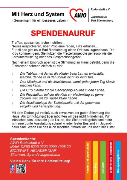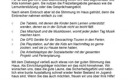 Mit dem Diebesgut verließ auch etwas von der guten Stimmung das Haus. Als Einrichtungsträger möchten wir das nicht hinnehmen. Wir wünschen uns, dass die gute Laune, das Sicherheitsgefühl und natürlich eine bunte Ausstattung schnell wieder fester Bestand im Jugendhaus sind. Wenn Sie das auch möchten, freuen wir uns über Ihre Hilfe!