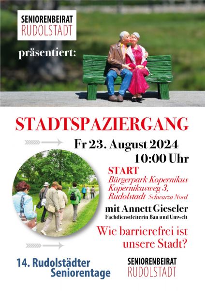 Am Freitag, den 23. August 2024, lädt der Seniorenbeirat Rudolstadt zu einem Stadtspaziergang durch das Neubaugebiet Schwarza-Nord ein. Treffpunkt ist um 10:00 Uhr im Bürgerpark Kopernikus. Wir wollen gemeinsam die Barrierefreiheit und Seniorentauglichkeit der Neubaugebiete erkunden und Verbesserungsvorschläge sammeln. Sei dabei und gestalte die Zukunft unserer Stadt mit!