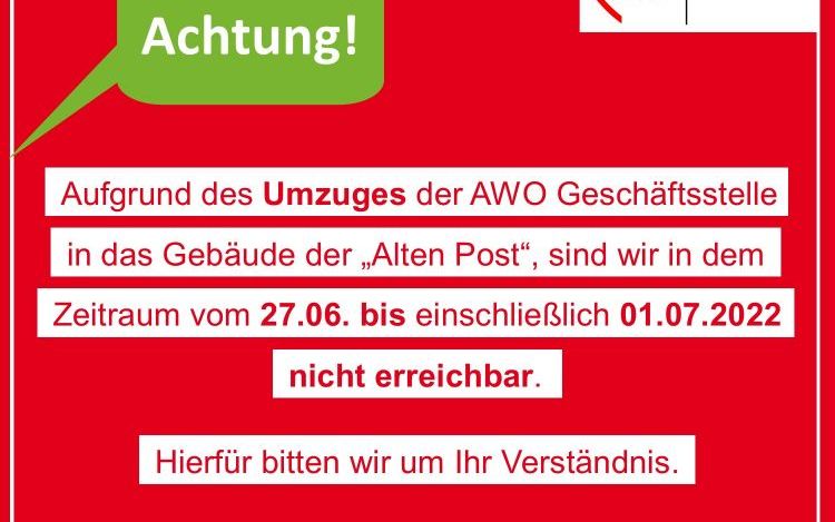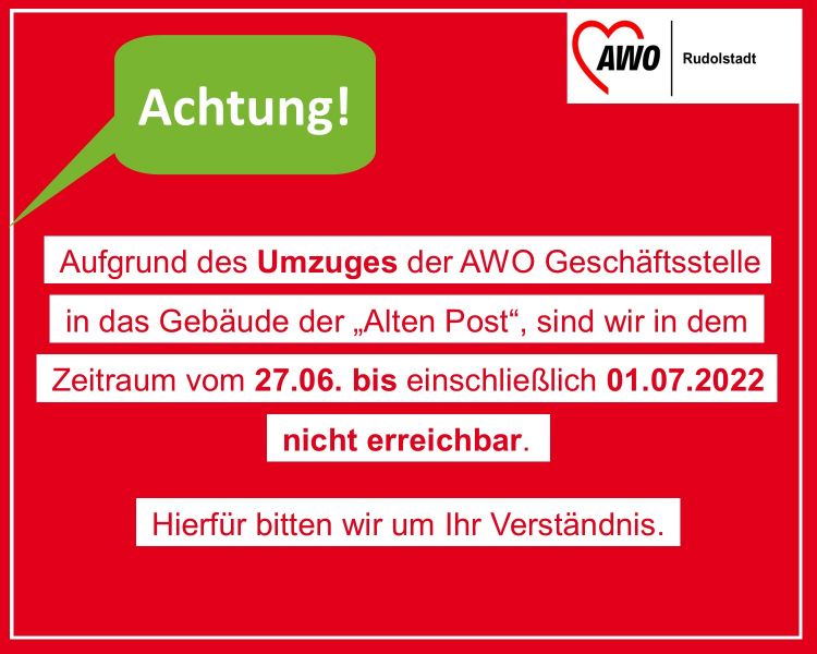 Wir freuen uns Ihnen mitzuteilen, dass die AWO Geschäftsstelle im Zeitraum vom 27.06. bis einschließlich 01.07.2022 in das Gebäude der „Alten Post“ in Rudolstadt einzieht. Aufgrund des Umzugs sind wir innerhalb dieser Woche nicht erreichbar.