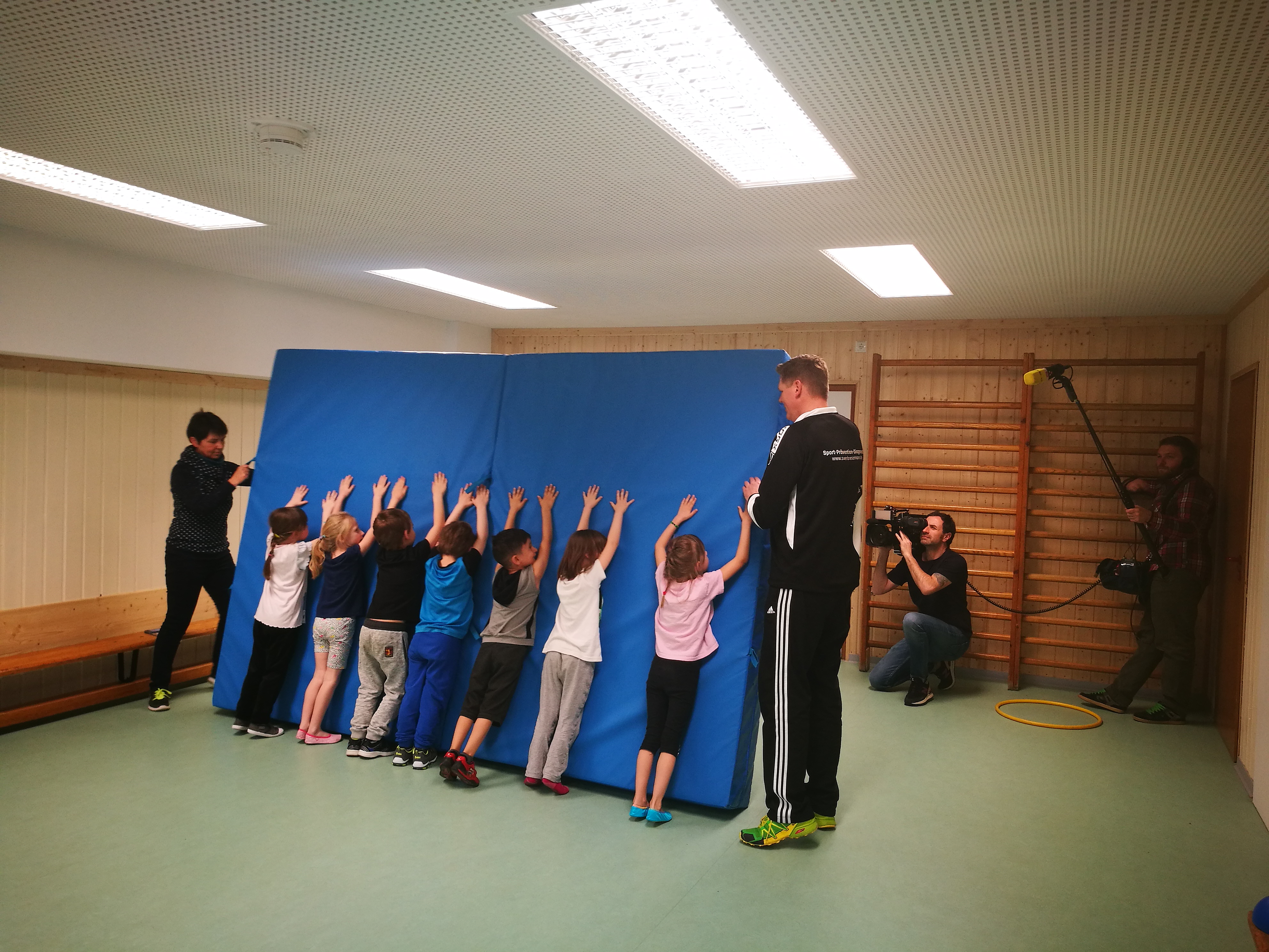 In Verbindung mit Farben und Zahlen folgten weitere spielerische Übungen, wobei vor allem Bewegung und Spaß im Vordergrund standen. Auch schon etwas Vorbereitung auf die Schule war dabei, etwa als der Sport-Präventions-Trainer anhand eines Modells die Wirbelsäule und Notwendigkeit der Bandscheiben erklärte. „Die Wirbelsäule macht, dass ich meinen Rücken bewegen kann.“ und „Sie hält meinen Kopf fest“, antworteten die Kinder auf die Frage, warum wir alle eine Wirbelsäule haben. Dies wurde sogleich beim Spiel mit scheinbar festgeklebten Füßen ausprobiert. Für die Kinder, die nach einer Stunde immer noch Lust auf Bewegung hatten, gab es neben dem Kamerateam heute eine weitere Besonderheit. Gestreckt und gelehnt an einer Matte durften sie samt der Matte umfallen und erfahren, welche Stabilität ihnen ihr Rücken gibt - so viel Spaß, dass fast jeder gleich zwei Mal wollte.