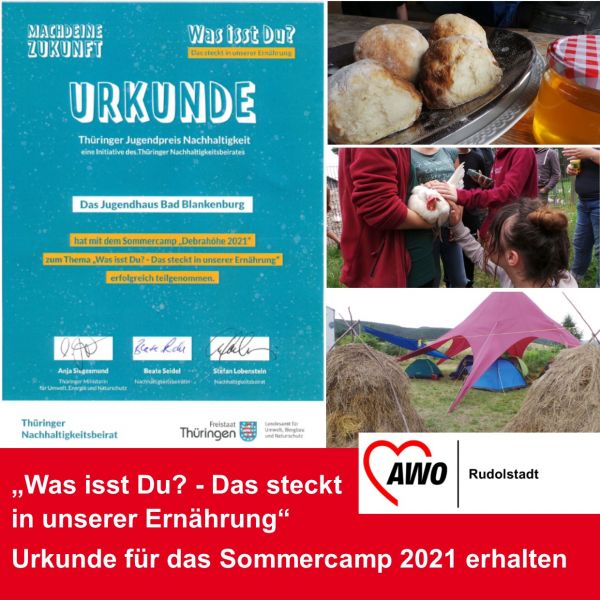 Das AWO Jugendhaus Bad Blankenburg und das AWO Jugend- und Familienhaus Rudolstadt veranstalteten vom 26. bis 30.07.2021 ein gemeinsames Sommercamp unter dem Motto "Woher kommen unsere Lebensmittel?“. Auf das Gelände des „Spielhofes Debrahöhe“ waren 10 Jugendliche eingeladen. Geschlafen wurde in Zelten und gekocht wurde auf dem Lagerfeuer oder im Lehmofen. Tagsüber lockten für die Teilnehmenden Ausflüge in die nahe Umgebung, z.B. in die Bäckerei Nestler-Mühle, zur Geflügelhof Teichweiden GmbH und in die Agrargenossenschaft Cathrinau e. G.. Überall wurden die Camper/innen mit Zutaten beschenkt, die zum Kochen verwendet wurden, wie Mehl, Sauerteig oder Eier.