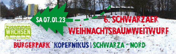 Nach zwei jähriger Zwangspause findet nun endlich am Samstag, den 07. Januar 2023 der Weihnachtbaumweitwurf im Bürgerpark Kopernikus, in Schwarza – Nord statt. Euch erwarten heiße Getränke, leckere Speisen, Feuerschalen und natürlich jede Menge Spannung und Spaß beim Zuschauen und Werfen der ausgedienten Weihnachtsbäume. Alle Teilnehmer erwarten attraktive Preise in drei Kategorien - Kinder, Frauen und Männer. Für alle Kategorien gibt es spezielle Turnierbäume und jeweils drei Preise. Mitgebrachte Bäume werden im Anschluss fachgerecht entsorgt.