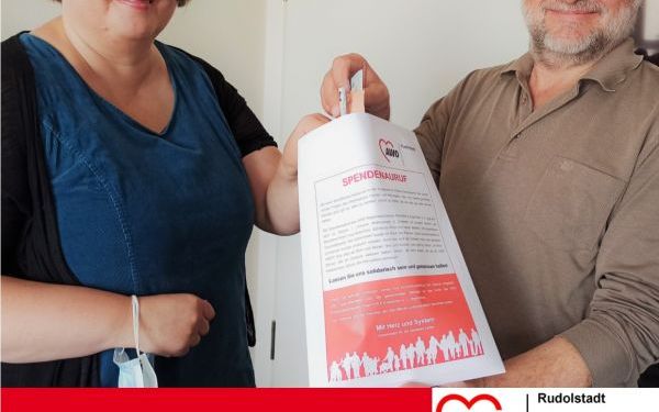 Zum Start unserer Spendenaktion befüllten Thea Kneisel, Leiterin unserer Friedrich-Adolf-Richter-Schule, und Hans-Heinrich Tschoepke, Geschäftsführer der AWO Rudolstadt, als erste Spender unser Spendentütchen.