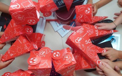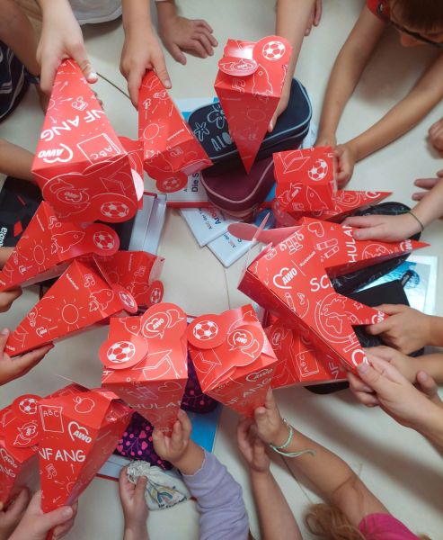 Gefüllt mit einer faltbaren Frisbee, bunten Stiften und kleinen Süßigkeiten wurde sie von Frau Lisa Bielert, Pädagogische Leiterin der Primarstufe, feierlich an die 21 neuen Schulanfänger überreicht.