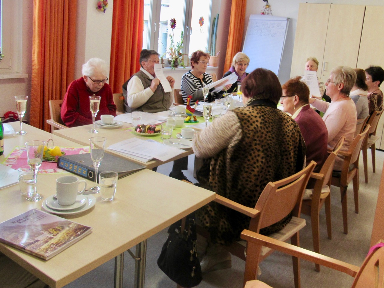 Wer rastet der rostet. Also ran an den Rost und mitgemacht. Unter fachlicher Anleitung durchläuft man die unterschiedlichsten Übungen im Sitzen. Im Anschluß sitzt man noch gemütlich zusammen, hört sich Geschichten an und singt gemeinsam lustige Lieder. Also ein rundum zufrieden stellender Nachmittag.
