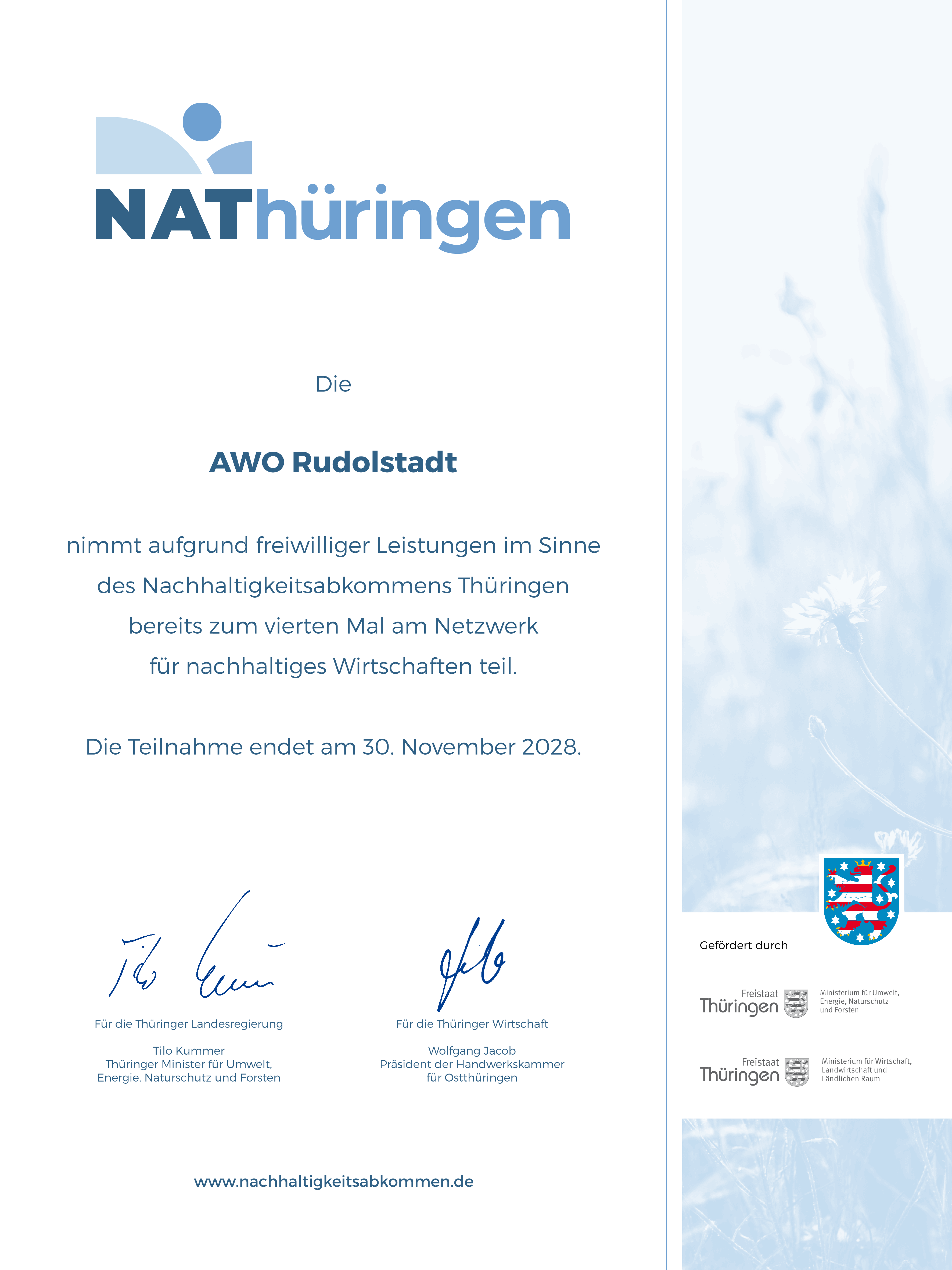 AWO Rudolstadt für nachhaltige Unternehmensführung geehrt - Urkunde des Thüringer Nachhaltigkeitsabkommens (NAT) für Leistungen zum Schutz der Umwelt und soziales Engagement