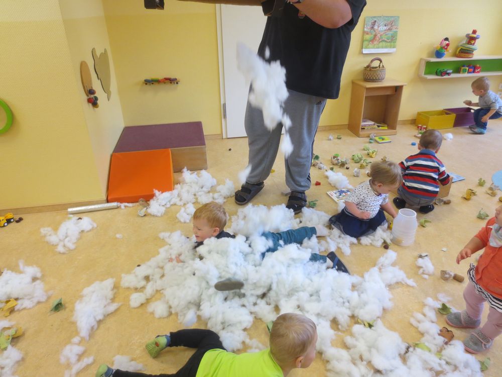 Die Schwerpunkte der Arbeit in der Krippe sind die Eingewöhnung der neuen Kinder und Eltern und die Bewältigung des neuen Alltags. Wir regen die Kinder zu größtmöglichster Selbstständigkeit an. Spielgäste aus den anderen Gruppen dürfen uns besuchen. So kommen viele neue Impulse in die Krippe.
