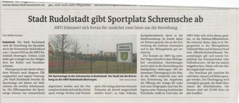 Die Stadt Rudolstadt bat die AWO Rudolstadt sich um den Sportplatz Schremsche zu kümmern, da der Stadt die Kapazitäten und auch öfters die Möglichkeiten fehlen.