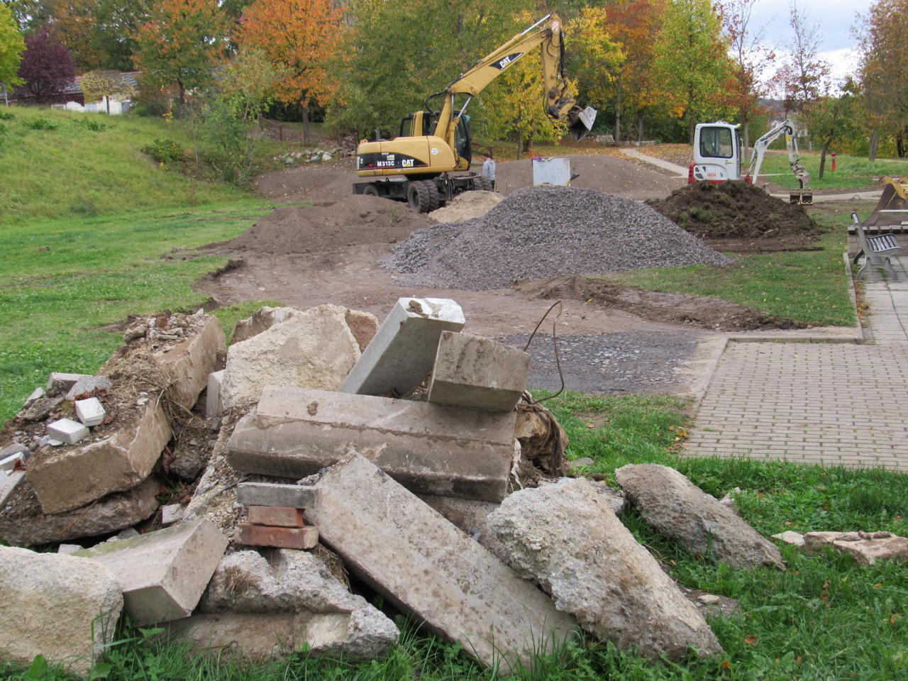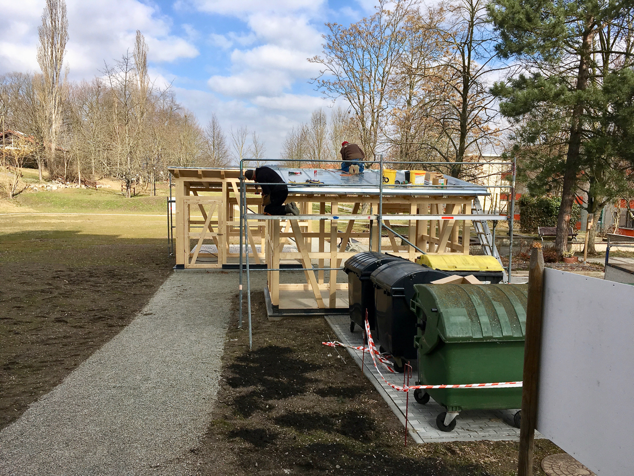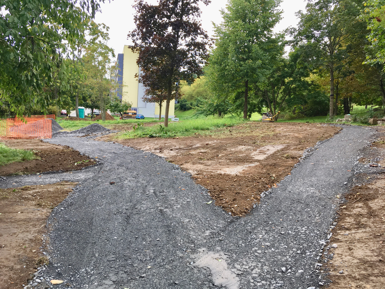 Nach mehrfacher Umplanung und weiterer Abstimmung mit den Bürger*innen haben im Herbst 2017 die Baumaßnahmen auf der Freifläche begonnen. Auf Grund von Kostenreduzierung mussten die studentischen Pläne mehrfach modifiziert und reduziert werden so daß für uns ein umsetzbares Konzept entstehen konnte. Eine ortsansässige Firma setzte den kompletten Wegebau sowie die Fundamente für zwei Funktionspavillions um. Eingebunden wurde die Müllplatzeinhausung des angrenzenden Wohnblockes und ein neues Beleuchtungskonzept.