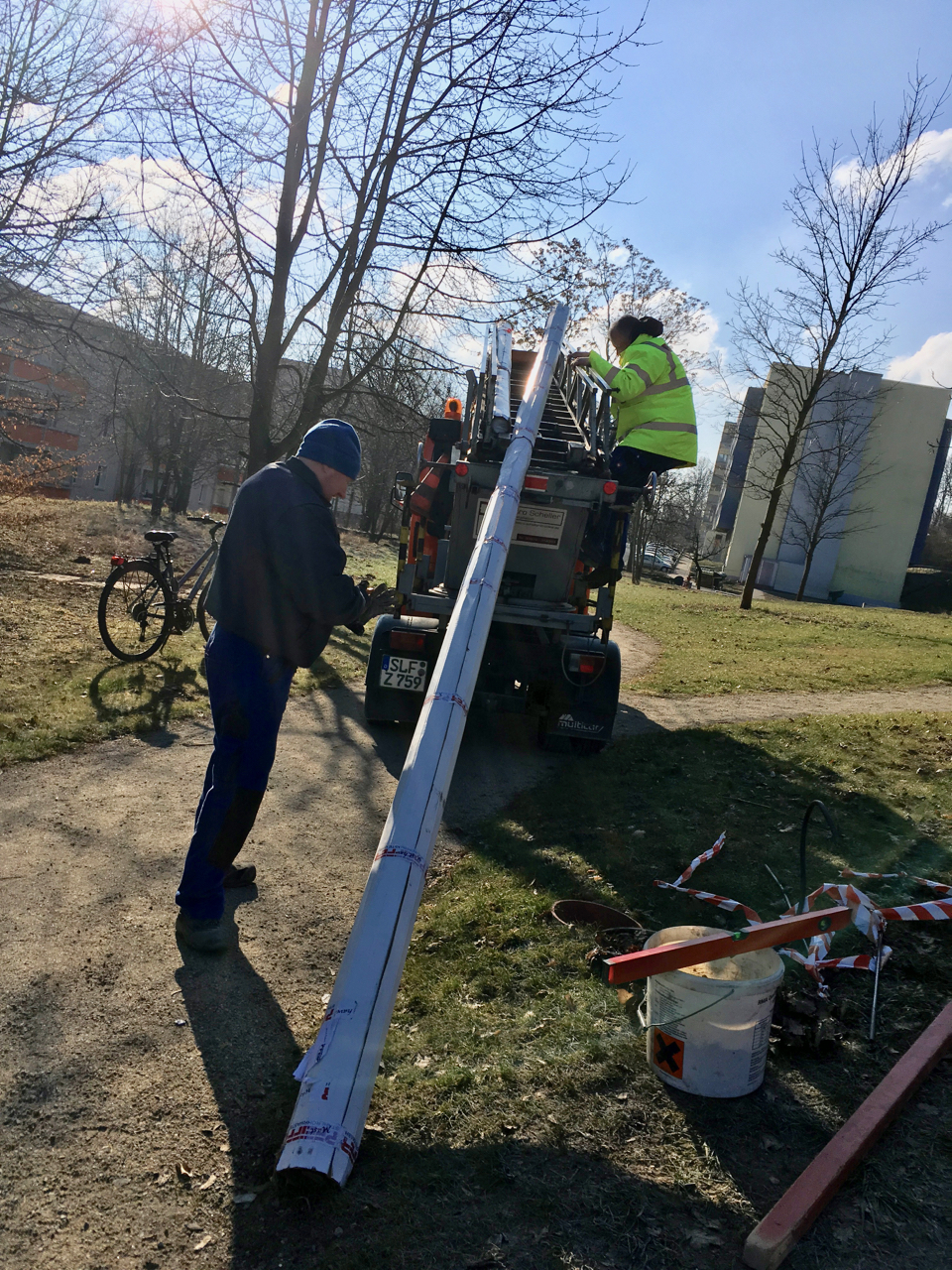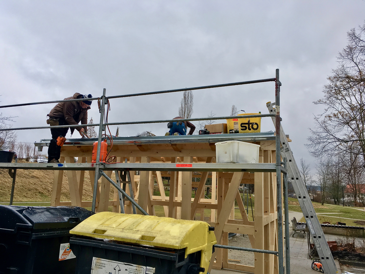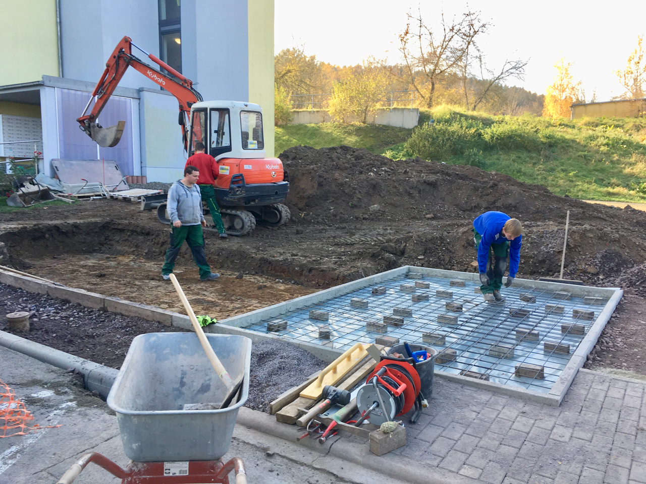 Nach mehrfacher Umplanung und weiterer Abstimmung mit den Bürger*innen haben im Herbst 2017 die Baumaßnahmen auf der Freifläche begonnen. Auf Grund von Kostenreduzierung mussten die studentischen Pläne mehrfach modifiziert und reduziert werden so daß für uns ein umsetzbares Konzept entstehen konnte. Eine ortsansässige Firma setzte den kompletten Wegebau sowie die Fundamente für zwei Funktionspavillions um. Eingebunden wurde die Müllplatzeinhausung des angrenzenden Wohnblockes und ein neues Beleuchtungskonzept.