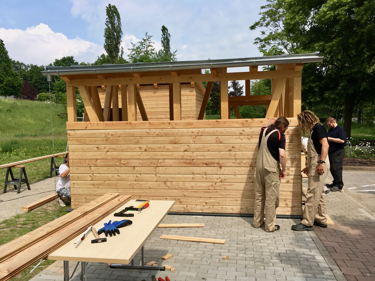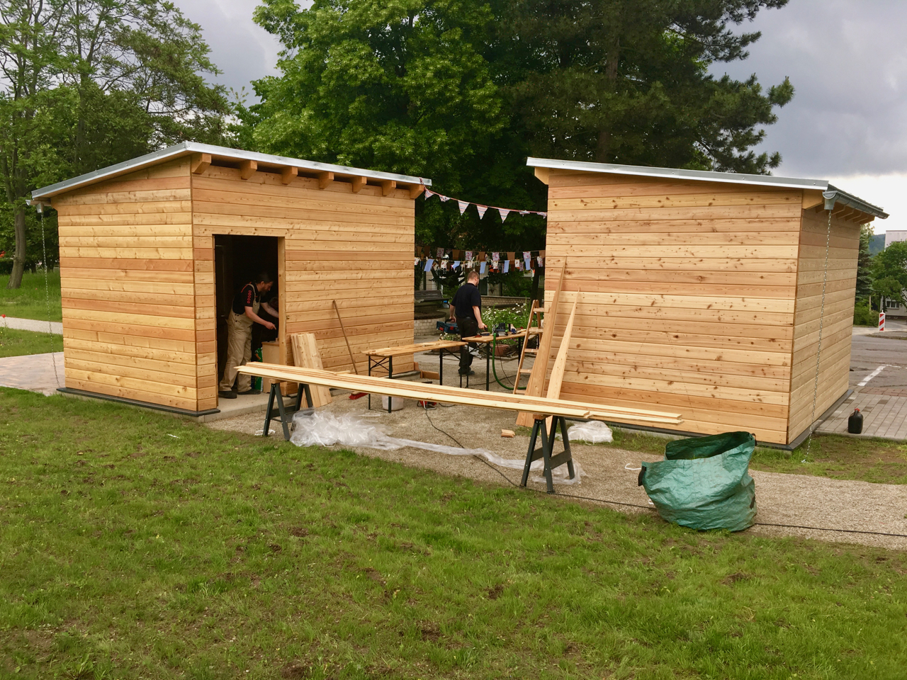 Die groben Baumaßnahmen waren im Dezember 2017 beendet, so daß wir im Januar unsere erste große Veranstaltung durchführen konnten. Ab März 2018 setzte eine Holzbaufirma den Rohbau der Funktionsbauten auf und wir stellten diese mit Hilfe von Ehrenamtlichen bis Ende Mai fertig. Am 26.05.18 wurden die zwei Pavillons mit einem tollen Frühlingsfest eingeweiht. Zwischenzeitlich haben wir für den nächsten Bauabschnitt neue Fördermittel beantragt und warten auf deren Genehmigung. Mit diesen Mitteln sollen die Ruheplätze im Park ausgebaut und die Fitnessbereiche entstehen. Parallel dazu wird sich das Hochbeetprojekt entwickeln.